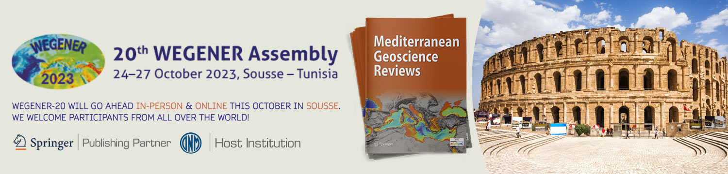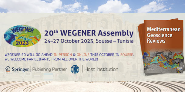 We are pleased to announce that the 20th WEGENER Assembly 2023 (WEGENER-20) will be organized by the National Office of Mines (ONM, Geological Survey of Tunisia) from 24 to 27 October 2023 in Sousse, Tunisia.
