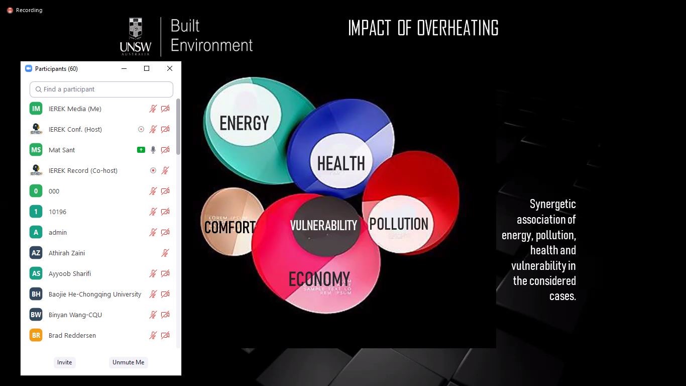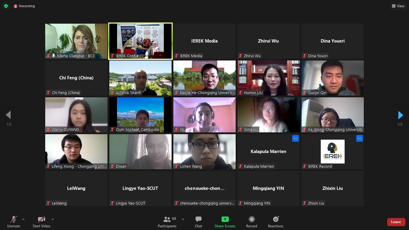 Following IEREK’s introduction, short welcoming speeches were given by the conference chair Research. Prof. Baojie He, School of Architecture and Urban Planning, Chongqing University, China & Green Talents Alumni of Federal Ministry of Education and Research, Germany, the conference co-chair Prof. Ayyoob Sharifi, Professor at Hiroshima University Graduate School of Humanities & Social Sciences, Japan; Lead Author of IPCC 6th & Associate Editor of Urban Climate Journal, Elsevier, the conference co-chair, Research. Prof. Chi Feng, School of Architecture and Urban Planning, Chongqing University, China, and the conference co-chair Prof. Jun Yang, Jangho Architecture Collage, Northeastern University, China.