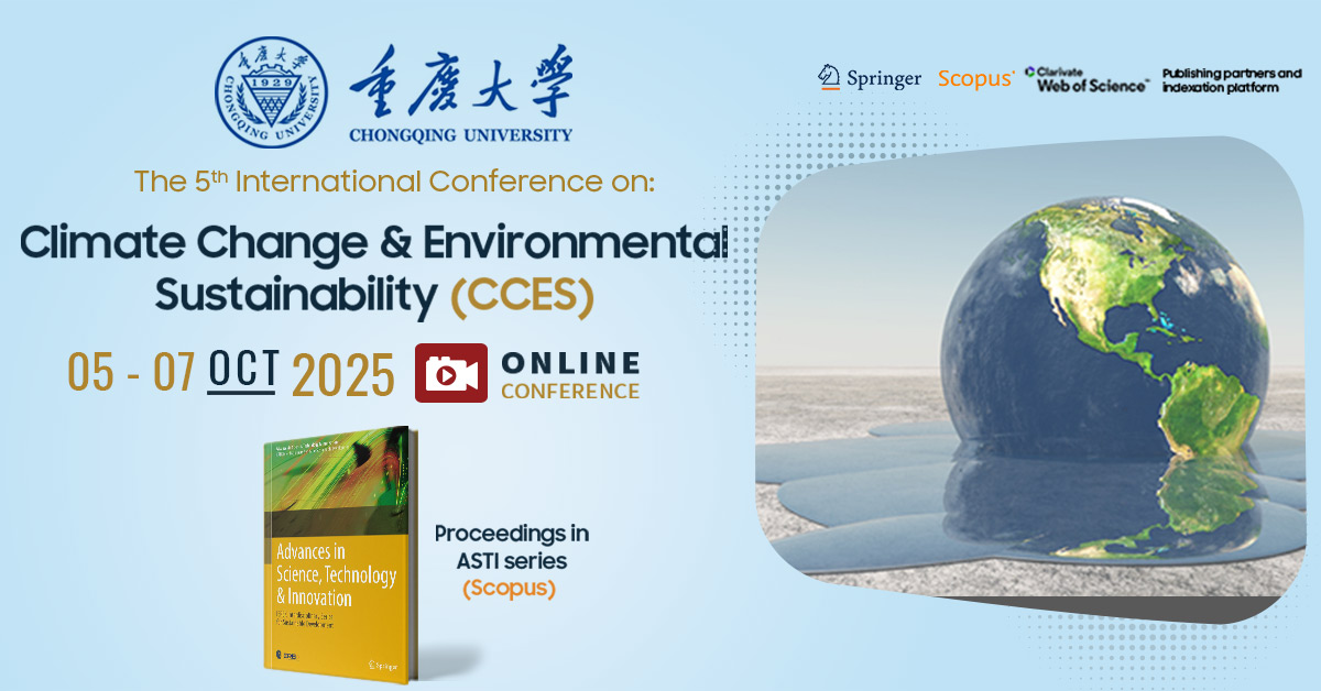 The 5th edition of the Climate Change and Environmental Sustainability (CCES) conference, taking place online from 05 to 07 October 2025, in collaboration with Chongqing University, China, will serve as a platform for interdisciplinary exchange. Bringing together researchers, practitioners, and policymakers, this conference will explore strategies for climate adaptation, mitigation, and sustainability. Through in-depth discussions, CCES aims to contribute to global efforts in shaping a future that prioritizes environmental responsibility and long-term resilience.