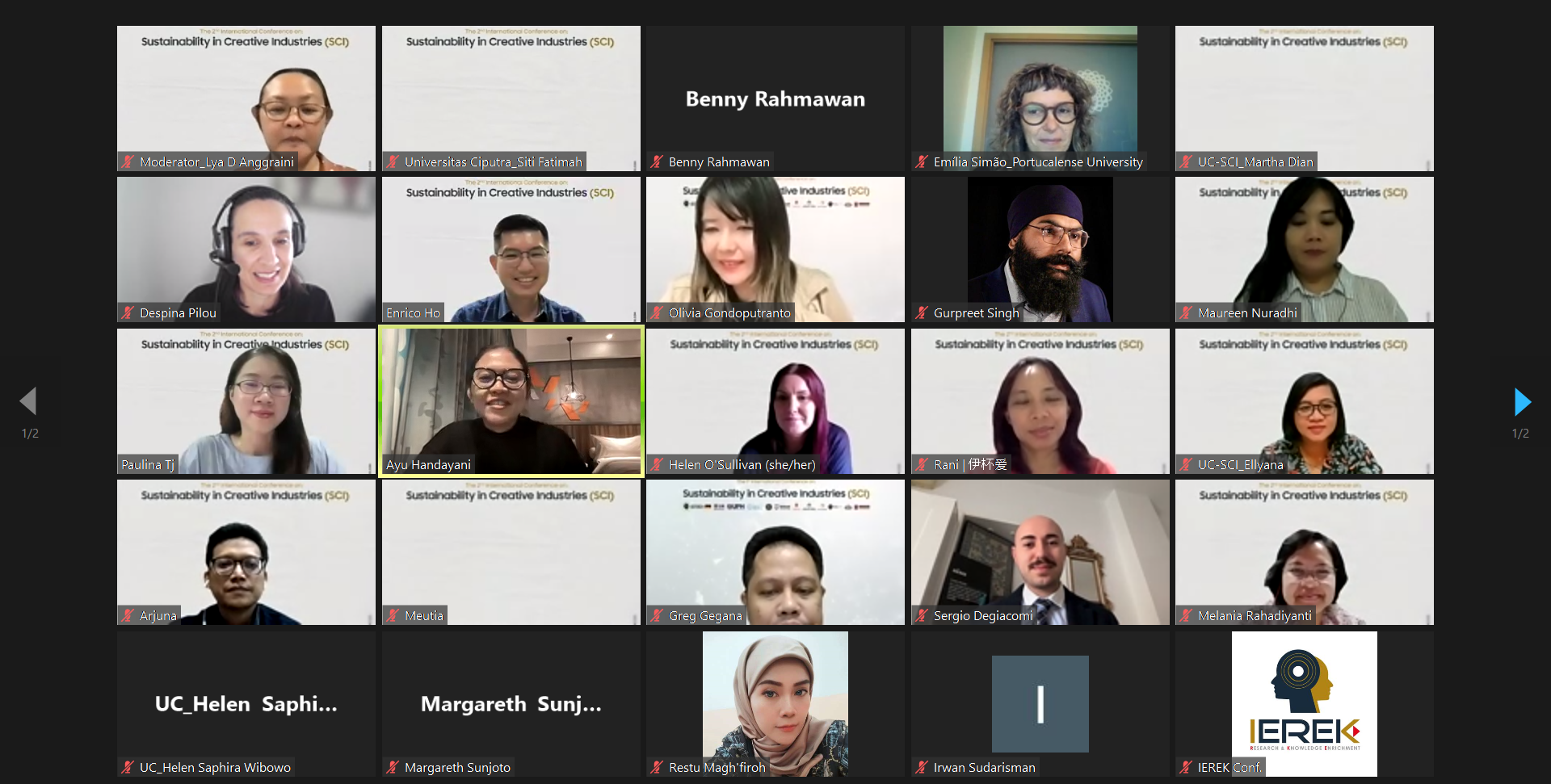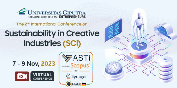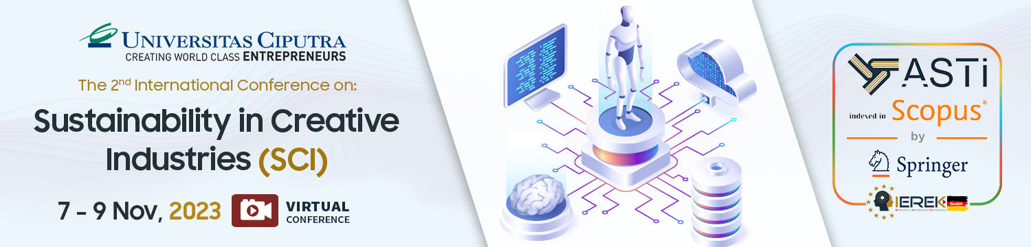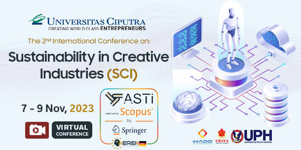 The second edition of the International Conference on “Sustainability in Creative Industries (SCI)” organized in collaboration with Universitas Ciputra Indonesia and other supporting co-hosts: Ikado Surabaya, Universitas Pelita Harapan, Universitas Surabaya (UBAYA). The conference was held online from the 7th to the 8th of November 2023.