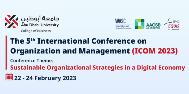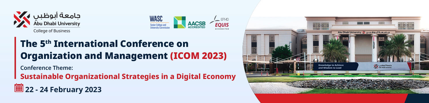 ICOM, the premier International Conference on Organization and Management, is presented annually by Abu Dhabi University’s College of Business. Delayed by the COVID-19 Pandemic, the conference will once again be hosted face to face in Abu Dhabi in February 2023. In line with the vision of the College of Business “To be recognized as a leading, globally connected business school creating and disseminating transformational knowledge and fostering sustainability for business and society”, the conference theme: Sustainable Organizational Strategies in a Digital Economy, focusses on Sustainability and Technology. The conference location further supports this theme as the United Arab Emirates is the first Middle Eastern nation to commit to achieving net-zero emissions by 2050. We welcome papers that examine organizational sustainability from the following perspectives: