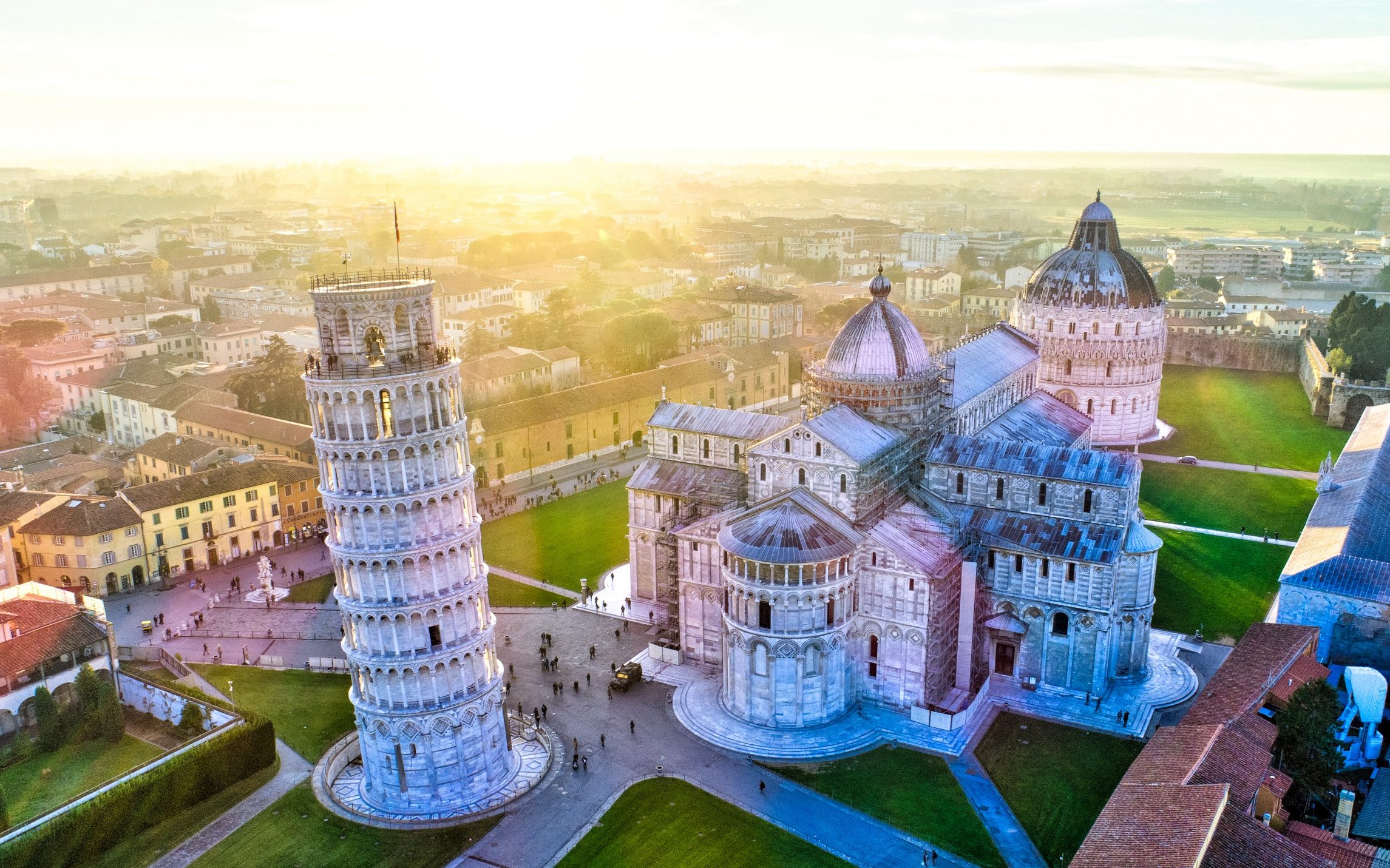 Pisa is now a quiet provincial university town that is well-known for its art and architectural treasures. While the  leaning Tower of Pisa originally known as ” the bell tower of the cathedral “, is the most famous image of the city, it is one of the many works of architecture in the city’s Square which is originally known as “Piazza del Duomo”, also known, since the 20th century as” Piazza dei Miracoli” (Square of Miracles), to the north of the old town centre. The Square of Miracles also houses the Cathedral“the Duomo”, the Baptistry and the monumental cemetery “the Campo Santo”. The medieval complex includes the above-mentioned four sacred buildings, the hospital and few palaces. All the complex is kept by the Opera (fabrica ecclesiae) della Primaziale Pisana, an old nonprofit foundation that operates since the building of the Cathedral to the maintenance of the sacred buildings. The area is framed by medieval walls kept by municipality administration.